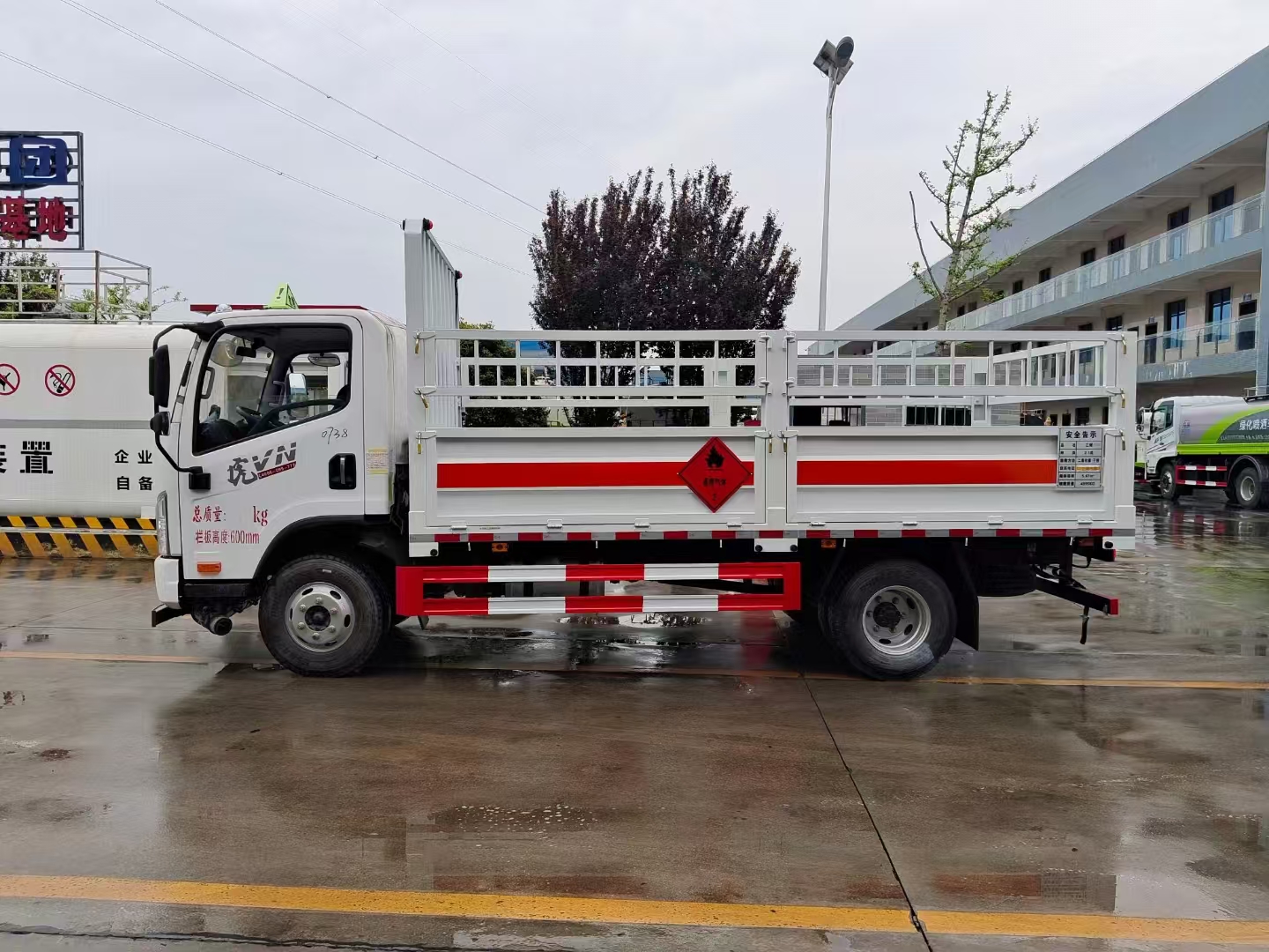 底盤配置 虎VN平頂單排駕駛室,錫柴CA4DB1A14E68,6GS42,270沖焊橋(速比4.875、輪距1640),速比4.875,7.50R1616層級真空胎,帶國產ABS,前盤后楔制動器,空調+電動門窗+中控鎖,氣喇叭,高架箱,80L鋁合金油箱,板簧3/7+3,前輪帶爆胎應急裝置,前碰撞預警+車道偏離輔助預警,前下防護,防飛濺擋泥板,排氣火花熄滅器,限速79km/h,北斗+GPRS行車記錄儀(帶視頻記錄功能),帶靜電拖地帶,NFH,危險品專用底盤
